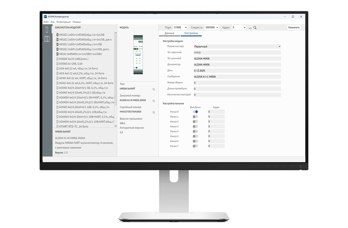 «Конфигуратор АЛДАН» — программное обеспечение для операционных систем Windows и Linux. Предназначено для настройки модулей, конфигурирования реек и станций ввода/вывода, а также их диагностики.