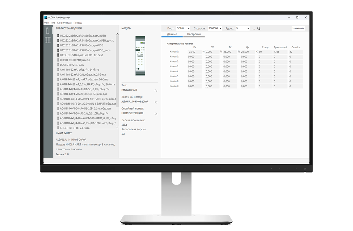 HART-функциональности через интерфейс RS485. Для HART модулей доступен мониторинг четырех HART-переменных на каждом канале в режиме реального времени. Программа отображает статистику HART-обмена, включая счетчики транзакций и ошибок связи по протоколу HART.